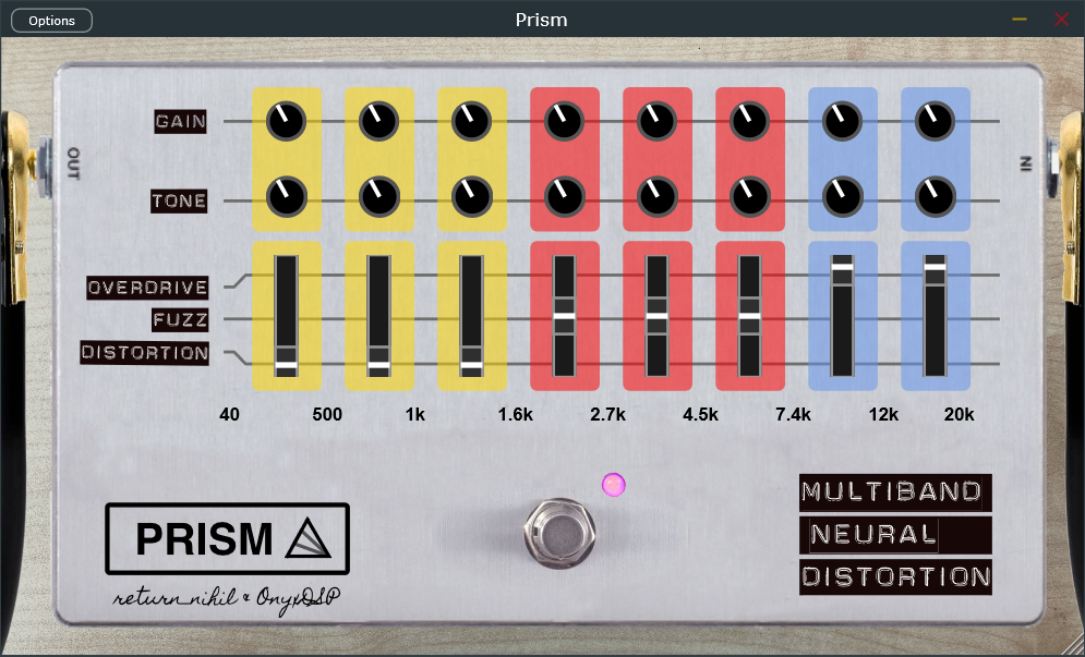 Prism is a multiband distortion audio effect that uses a single neural network to apply separate distortion effects (overdrive, fuzz, distortion) to different frequency bands of your audio signal.